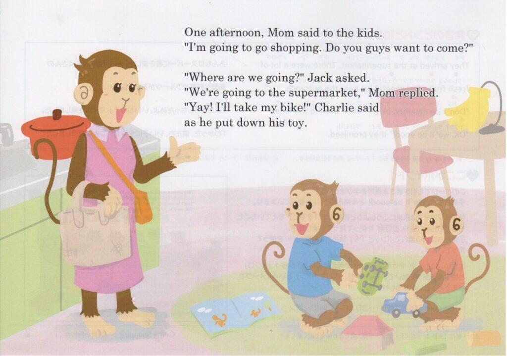 おさるのジャックとチャーリーはお母さんとスーパーへお買い物に出かけます。