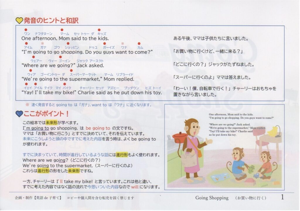 この絵本では未来形の3つの表現方法(① be going to、 ②進行形、 ③ will )について学べます。